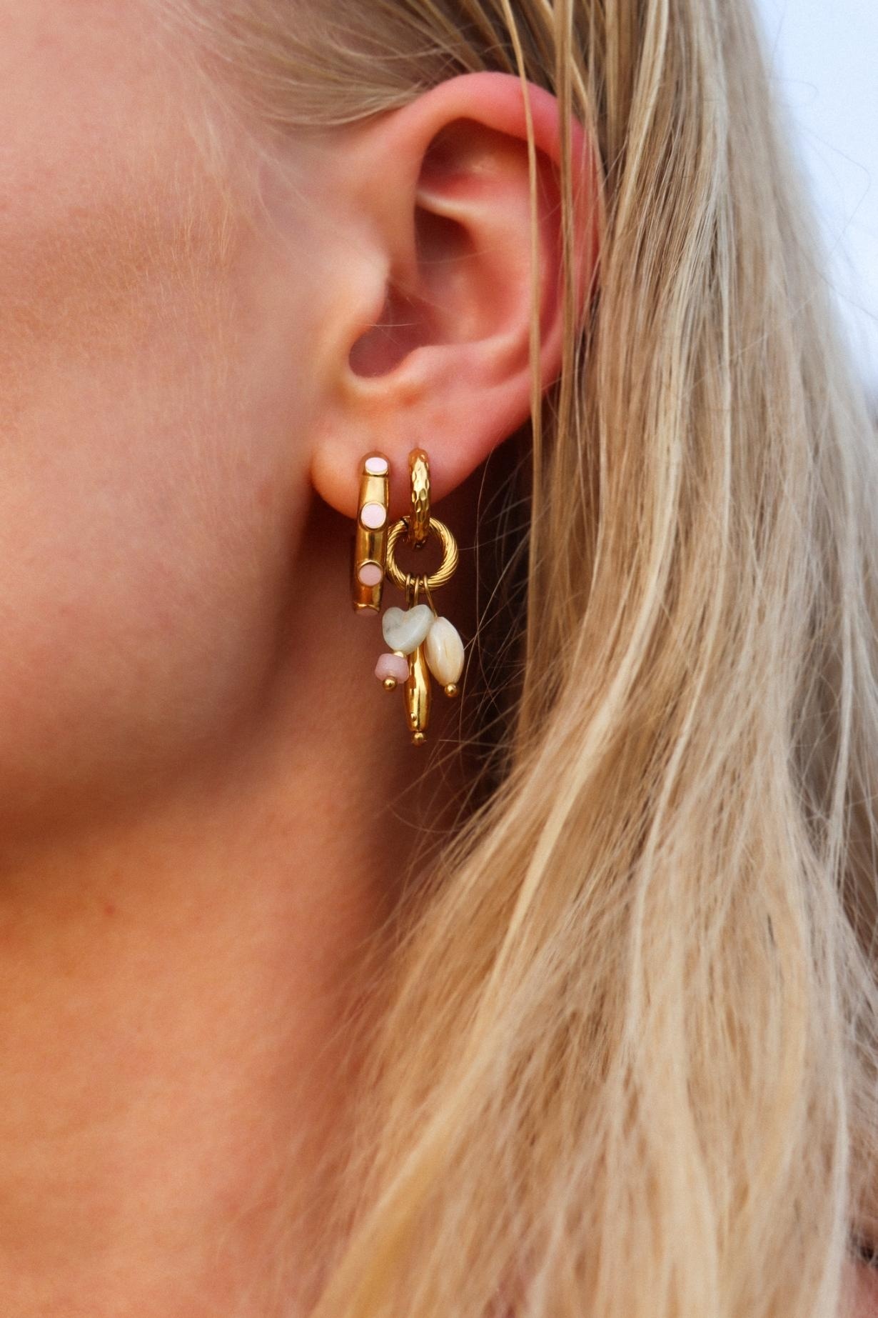 Deze oorbel blijft langer mooi als hij niet met water of parfum in aanraking komt.