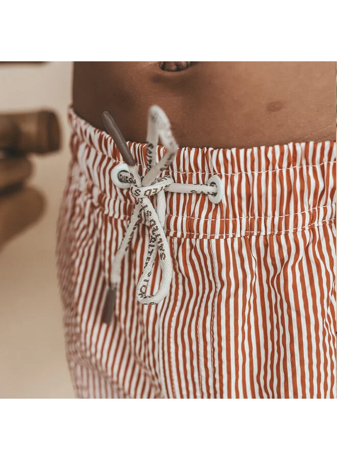 Deze Salted Stories jongens zwembroek is de perfecte combinatie van comfort en stijl. Net als de herenvariant is deze zwembroek uitgevoerd in een seersucker stof, wat zorgt voor een subtiele, licht golvende structuur in het materiaal. Hierdoor ligt de stof iets van de huid af en voelt de zwembroek extra luchtig aan op warme dagen. De fijne verticale streep geeft de zwembroek een rustige en tijdloze uitstraling. Onderaan is een subtiel geborduurd detail toegevoegd dat zorgt voor een speelse finishing touch. De elastische tailleband met verstelbaar koord zorgt voor een comfortabele en goed aansluitende pasvorm. De lichtgewicht zwemstof droogt snel en biedt volop bewegingsvrijheid tijdens zwemmen, spelen en ontdekken. Dankzij het minimalistische design is deze jongens zwembroek perfect te combineren met de herenvariant voor een stijlvolle father & mini look. Op zoek naar een jongens zwembroek met structuur die zowel comfortabel als tijdloos is? Deze seersucker zwembroek is een echte zomer essential.